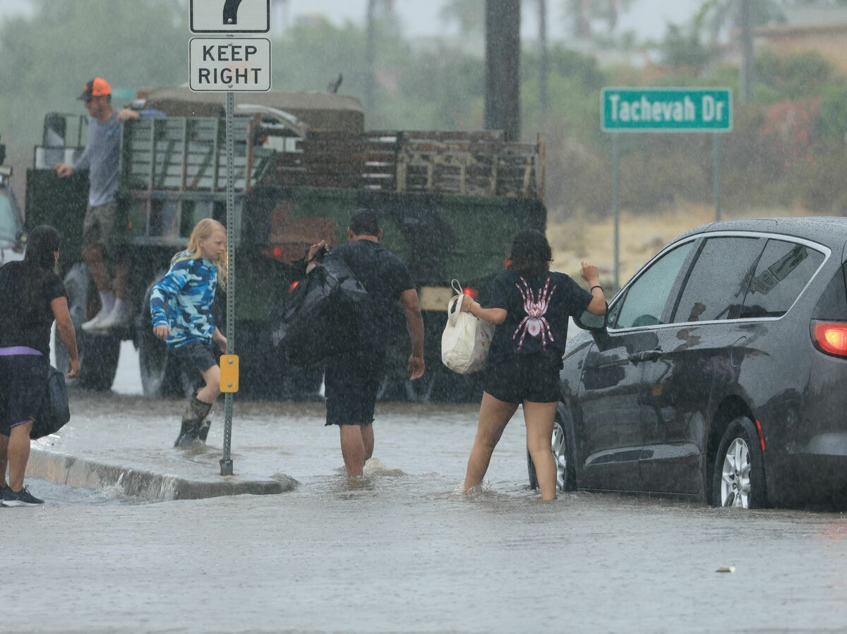 Motorists leave their vehicle stuck on a flooded road during heavy rains from Tropical Storm Hilary in Palm Springs, Calif., on Sunday.
