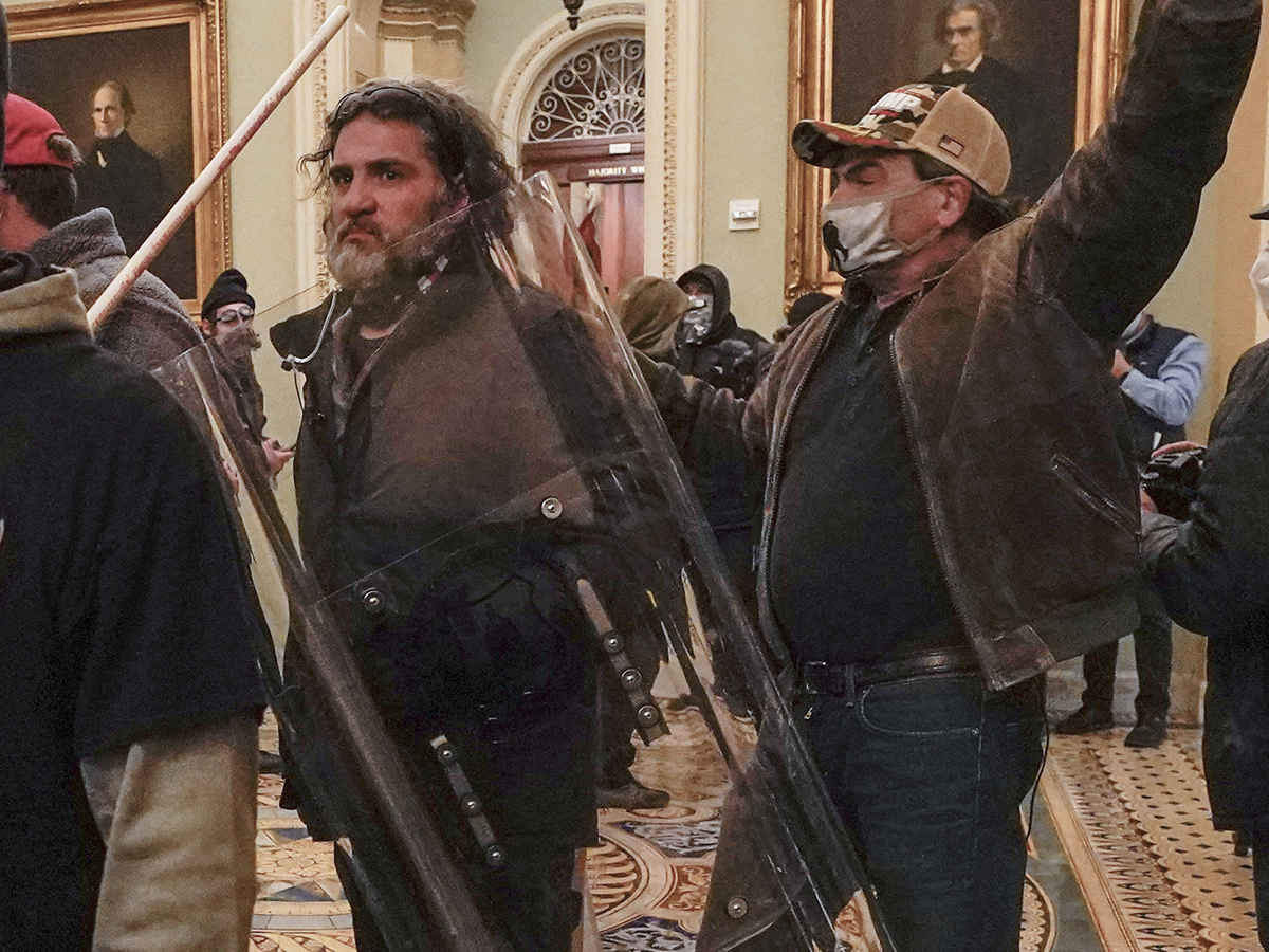 In this Jan. 6, 2021, photo, rioters, including Dominic Pezzola, with a police shield, are confronted by U.S. Capitol Police officers outside the Senate chamber inside the Capitol on Jan. 6, 2021.