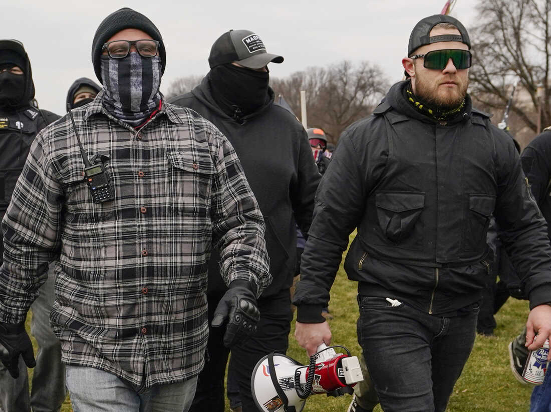 Proud Boys members Joseph Biggs, left, and Ethan Nordean, right with megaphone, walk toward the U.S. Capitol in Washington, Jan. 6, 2021.