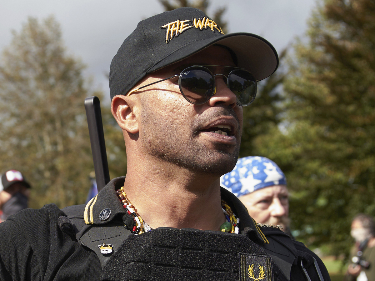 Proud Boys leader Enrique Tarrio speaks at a rally in Delta Park on Sept. 26, 2020, in Portland, Ore.