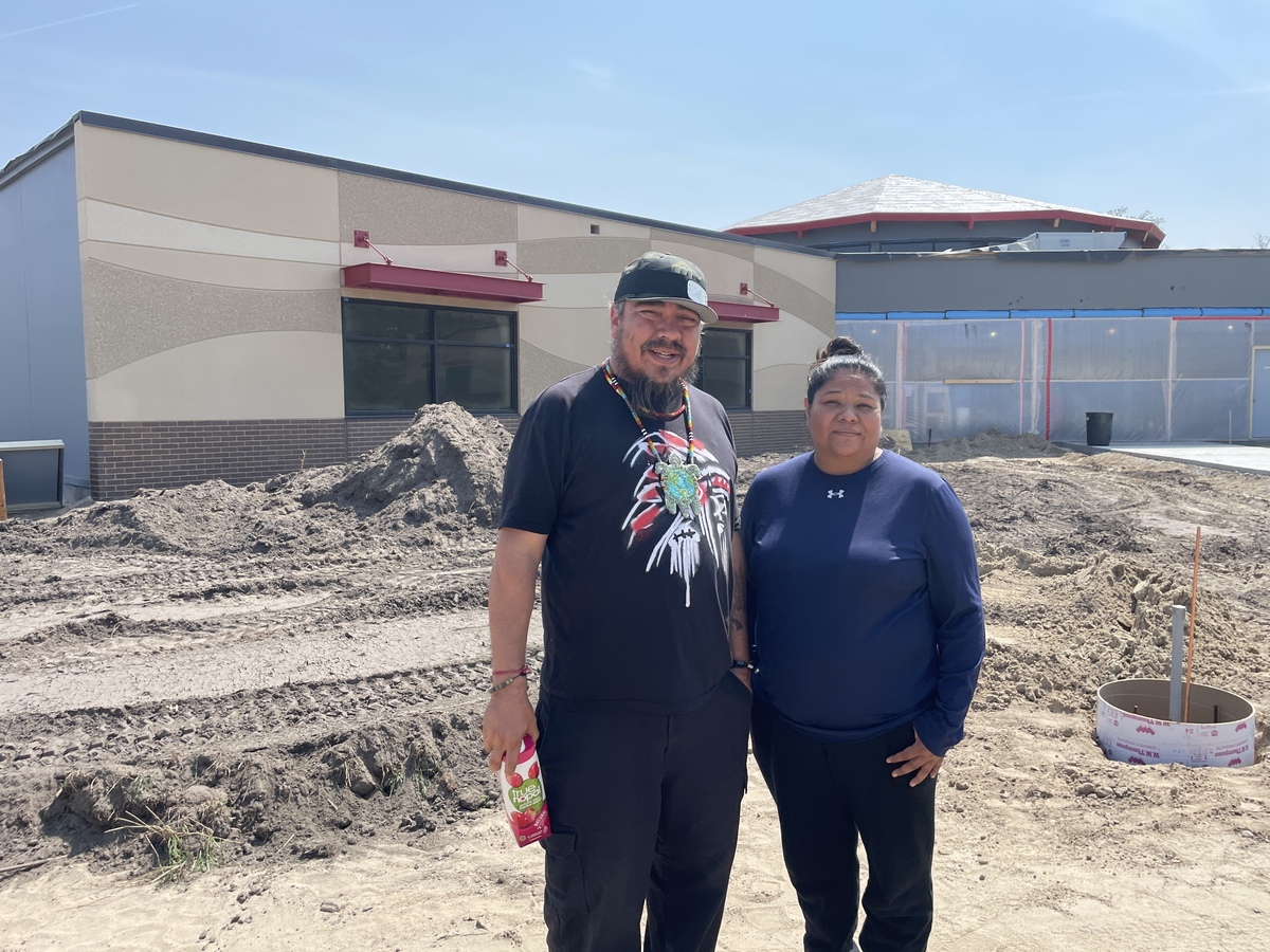 Nate Taylor (left) and Sylvia Fred (right), two of the co-founders of the Endazhi-Nitaawiging Charter School on Red Lake Reservation standing in front of the construction site for a new school building.