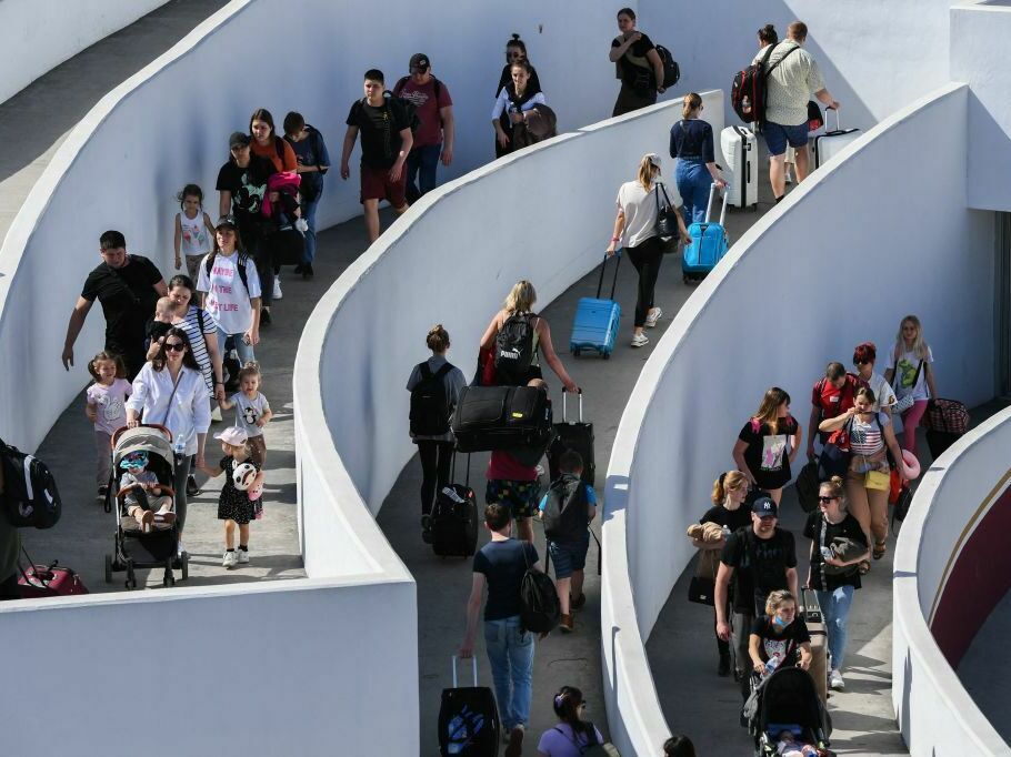 Ukrainian refugees enter the El Chaparral border crossing between Tijuana, Mexico, and San Diego in April 2022. The foreign-born share of the U.S. population, which had been roughly flat since 2017, rose to nearly 14% last year. Patrick T. Fallon/AFP via Getty Images hide caption