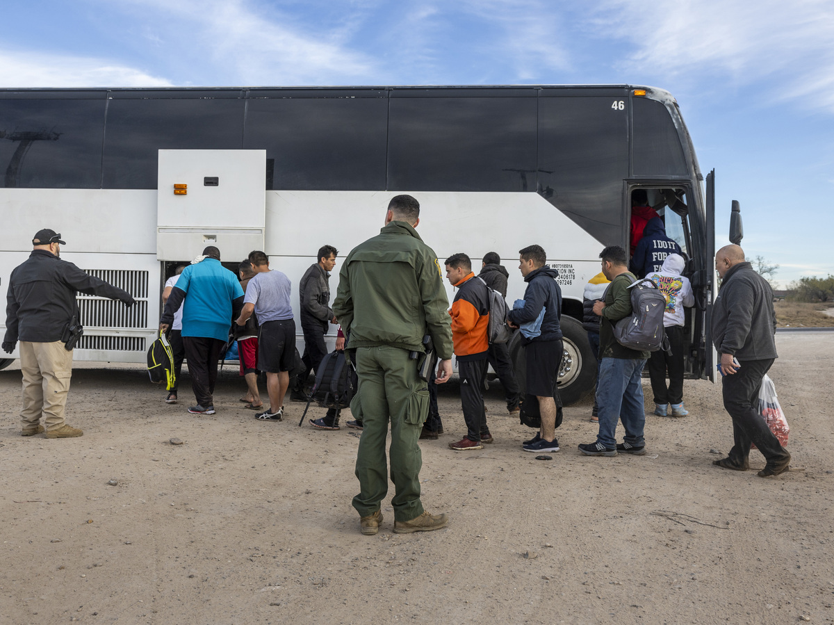 Immigrants file into a U.S. Customs and Border Protection bus after crossing the U.S.-Mexico border on January 07, 2024 in Eagle Pass, Texas.