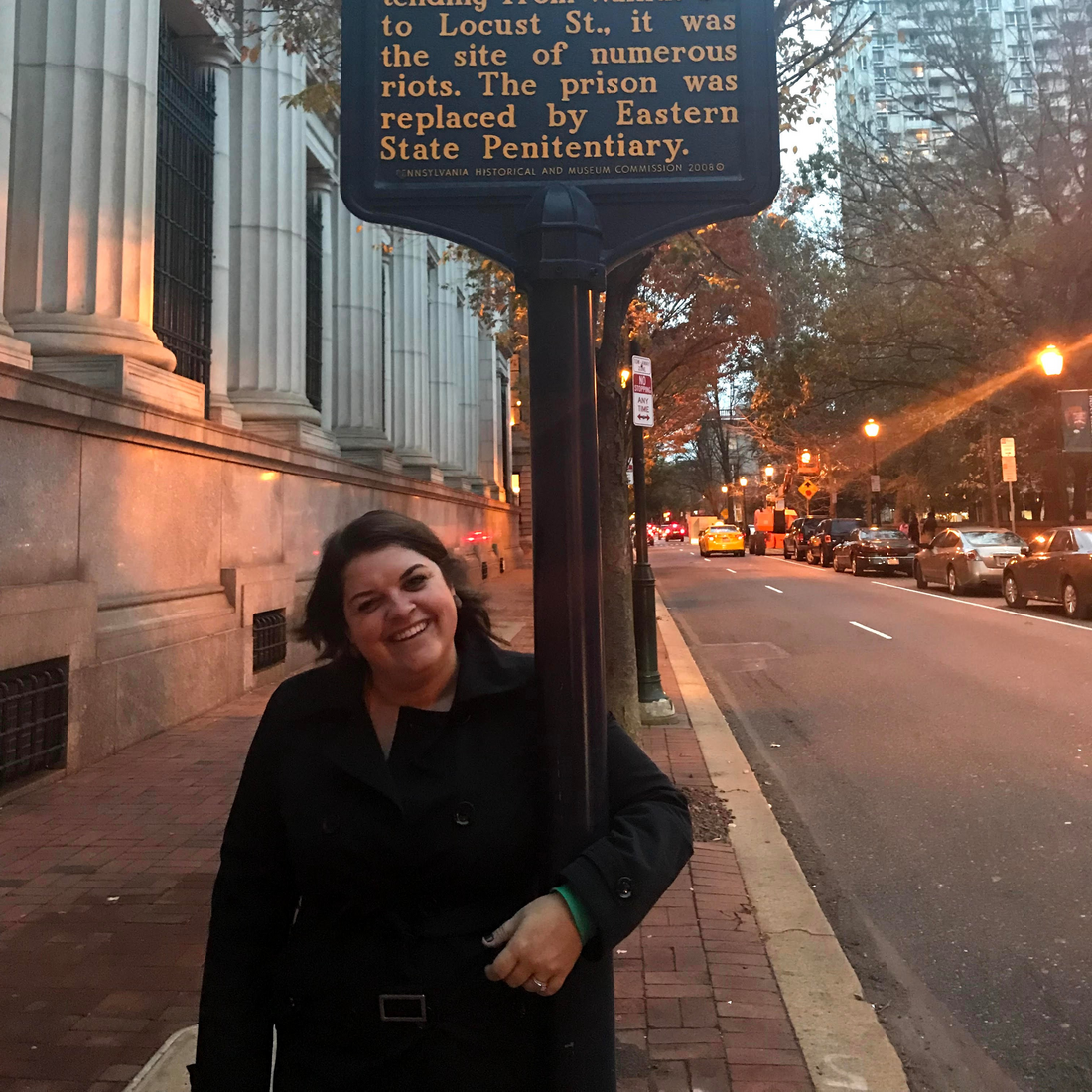 Questioner Andrea Krieg at the site of the Walnut Street Prison, a city jail and penitentiary house in Philadelphia, Pennsylvania from 1773 to 1838. Andrea Krieg/WBEZ hide caption