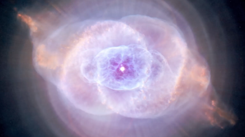 BG: Traveling through space, we encounter a spiral galaxy. M81, similar to our own Milky Way, is one of the brightest galaxies that can be seen from Earth. Its spiral arms wind all the way down into the nucleus and are made up of young, bluish, hot stars formed in the past few million years, while the central bulge contains older, redder stars. Zooming directly into this red center, we wind up in the midst of the glowing gas ejected by a dying Sun-like star called a planetary nebula. We continue to explore other planetary nebula forms with amazing and confounding shapes. They dance for us, and morph into one another, entrancing and beautiful, inviting reflection on our place in the Universe, tenuous as it is. At the musical, physical, and emotional climax, we confront a light echo, the expanding illumination of a dusty cloud around a star, pulsating along with the music, echoing the grand celestial end, but also foreshadowing an inevitable and shattering re-birth.