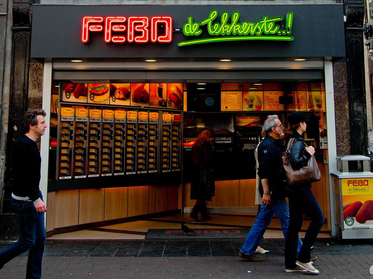 Today, Amsterdam's Febo chain of stores feature only vending-machine service for burgers, fries and more. A few employees are responsible for stocking the items behind the machines but way out of customer view, so you can walk up, drop in your coins and get a hot meal after a long night out without talking to anyone face-to-face.