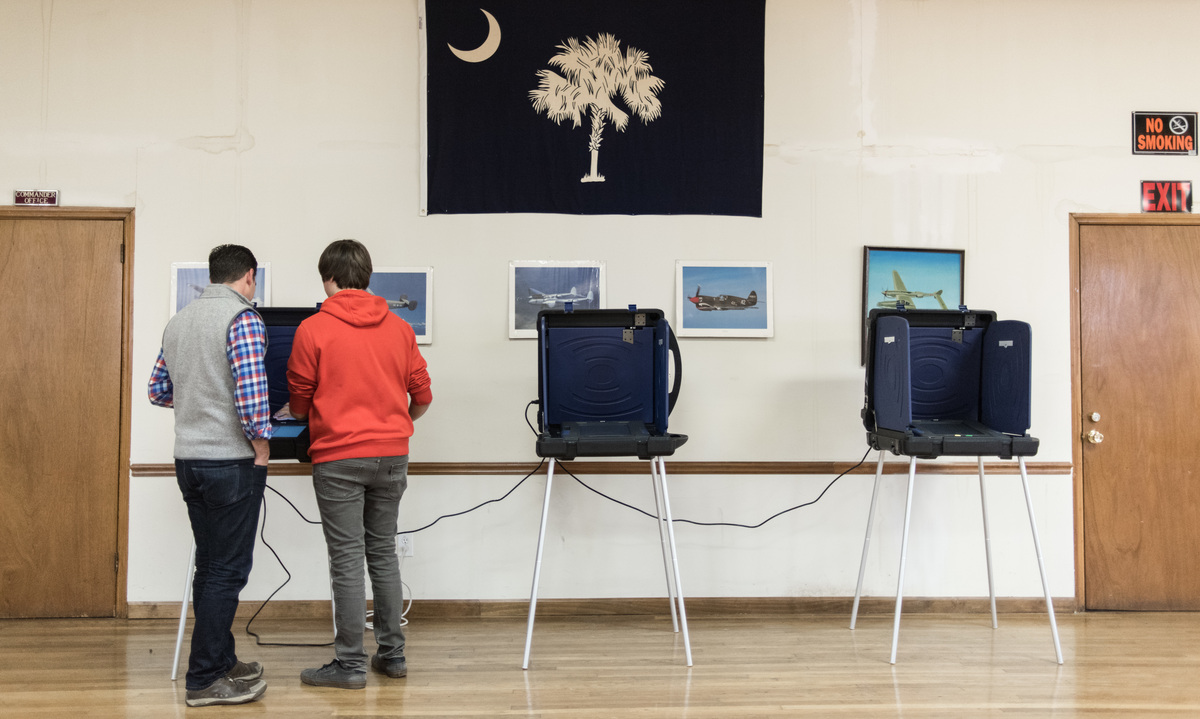 Polling station chairman helps a voter at a voting machine during the Republican presidential primary in February in West Columbia, S.C.