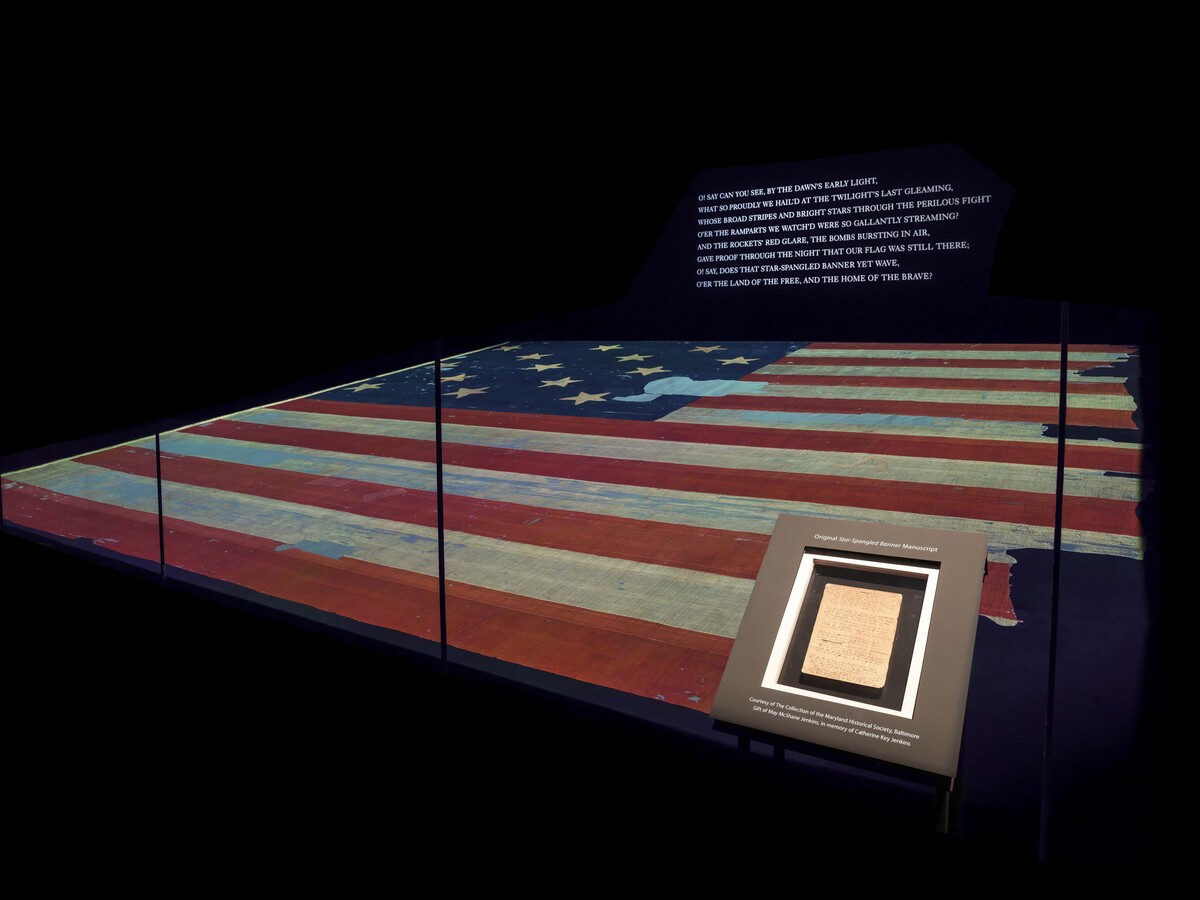 The Star-Spangled Banner manuscript and flag together in a gallery at the National Museum of American History.