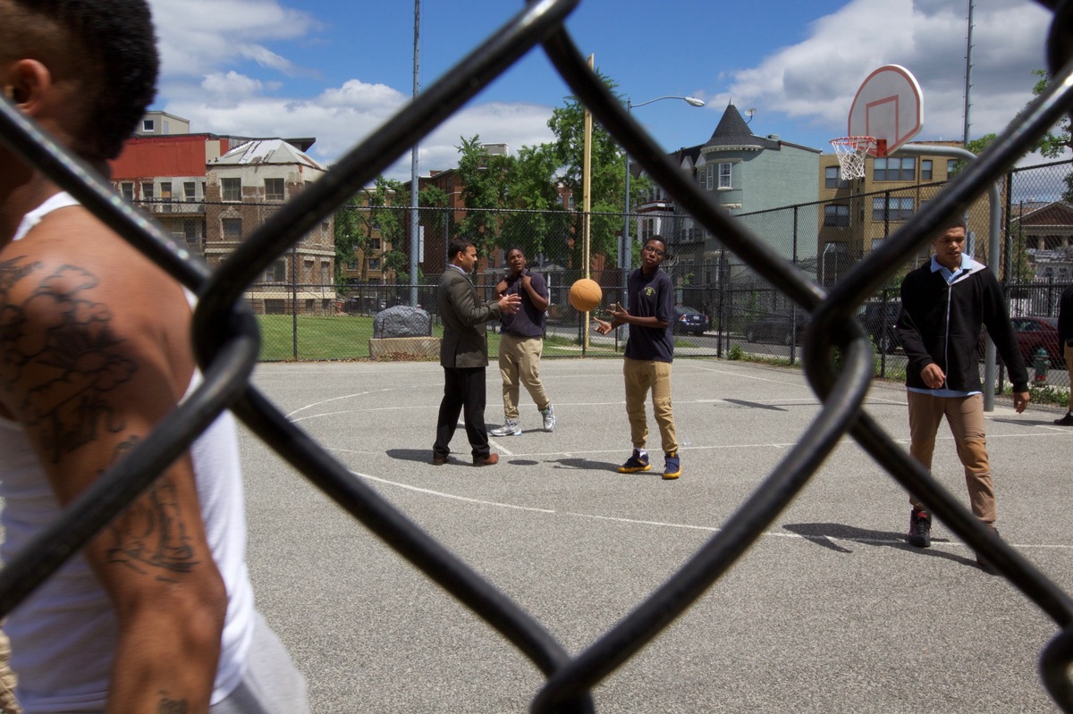On this day, he quickly confiscates a basketball from a student dribbler. "You know the rules, man," he tells him. "Pull up your pants please, sir," he shouts to a saggy-jeaned sophomore nearby.