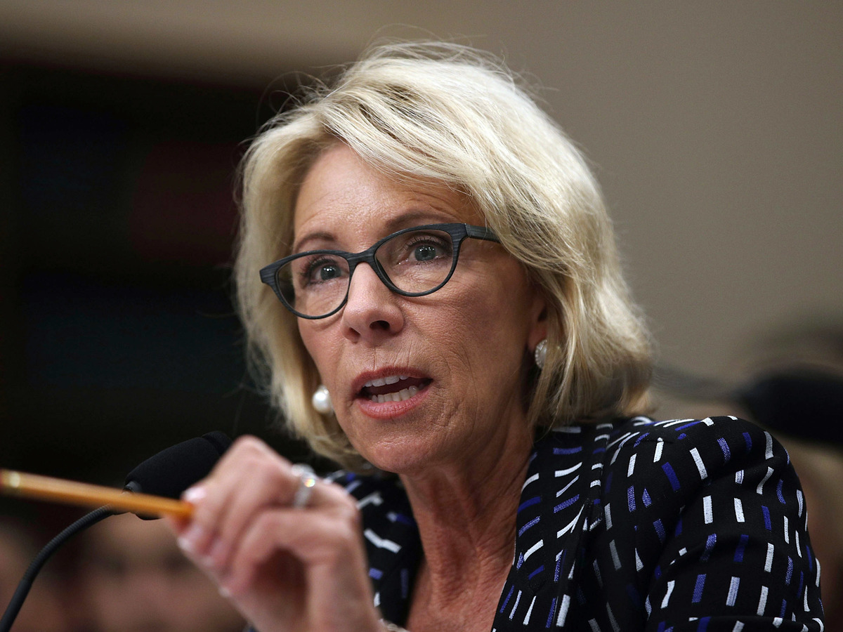 Secretary of Education Betsy DeVos testifies during a hearing before the Labor, Health and Human Services, Education and Related Agencies Subcommittee of the House Appropriations Committee May 24, 2017 on Capitol Hill in Washington, D.C. Alex Wong/Getty Images hide caption
