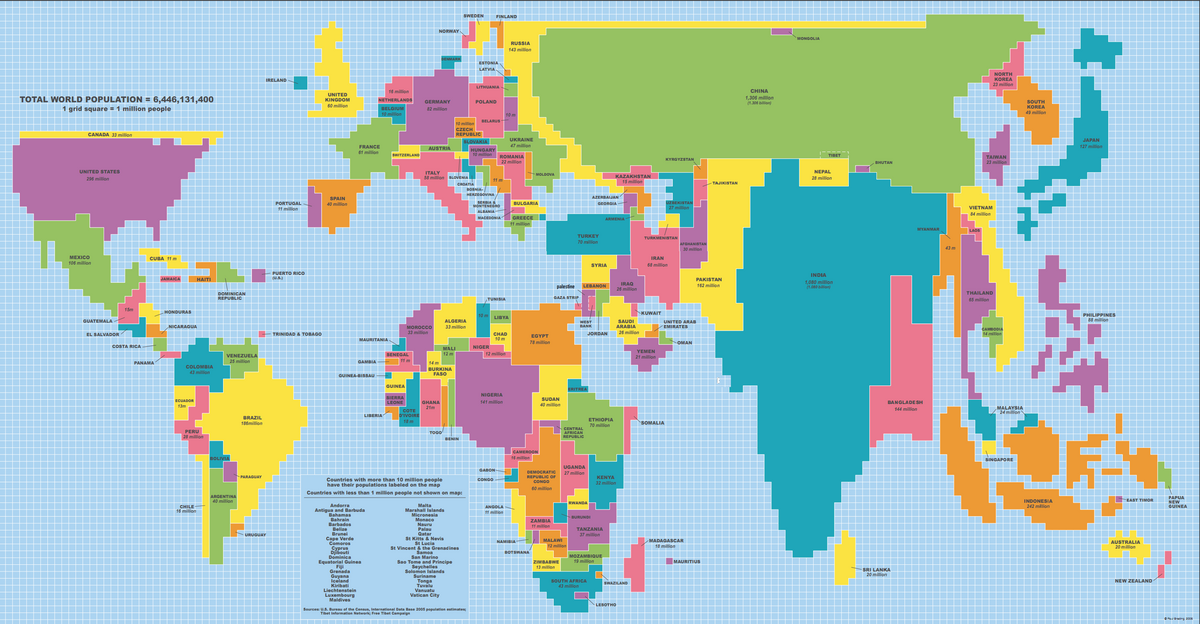 Paul BredingThat's how we felt when we saw the awesome map made by Reddit user TeaDranks. The map resizes countries based on their population. It's simple: Each square represents 500,000 people.