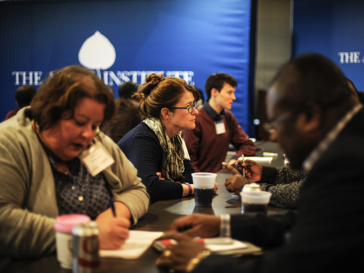 Reporters (left) interview the Aspen fellows during the session. Akash Ghai/NPR hide caption