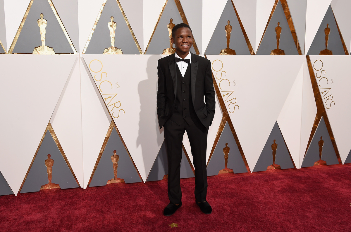 Actor Abraham Attah attends the Academy Awards in a tux and Toms footwear.