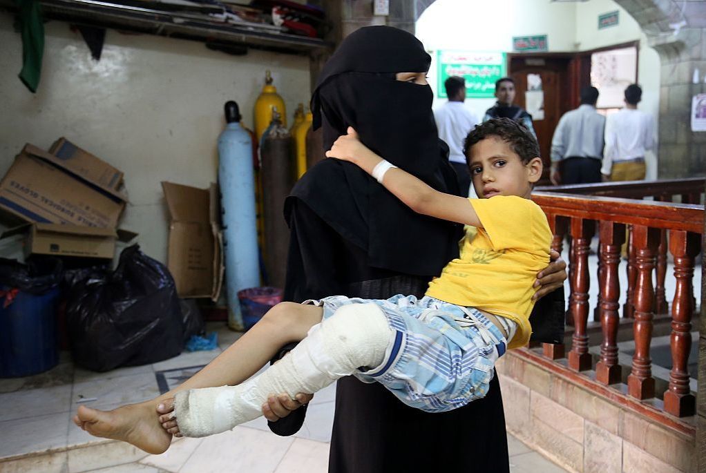 A woman carries a boy to a hospital in Taiz, Yemen. He was injured in an attack by the Houthi rebel group.