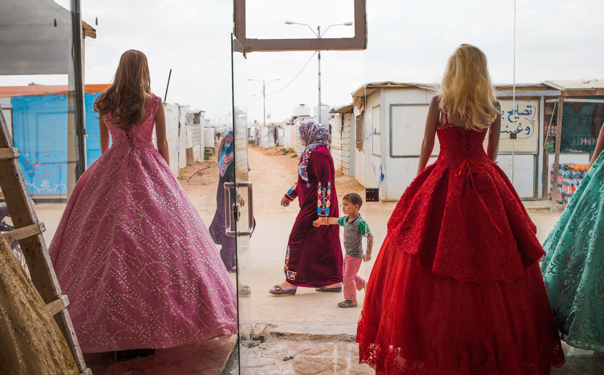 Wedding dresses come in bold hues at Salon Al Fardous — Paradise Salon. The rent-a-gown shop looks out on the temporary housing and makeshift stores in the Zaatari refugee camp in Jordan.