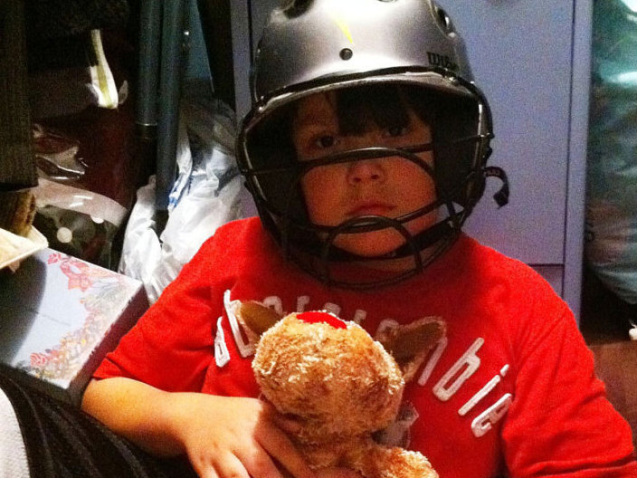 Noah Stewart shelters in the closet just 15 minutes before an April 2011 tornado demolished his house. Wearing the helmet may have saved his life, one doctor says. Courtesy of the Stewart family hide caption