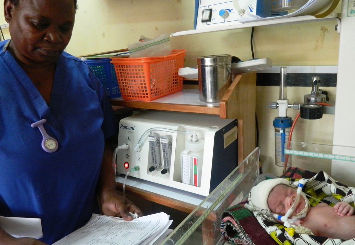 Neonatal nurse Florence Mwenifumbo monitors a newborn receiving bubble CPAP treatment in Blantyre, Malawi. The device was developed by students at Rice University in Houston.