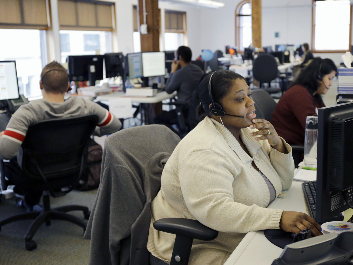 Loretha Cager talks with an applicant at MNSure's call center in St. Paul, Minn., Monday. Monday was the open enrollment deadline for signing up for insurance under the Affordable Care Act.