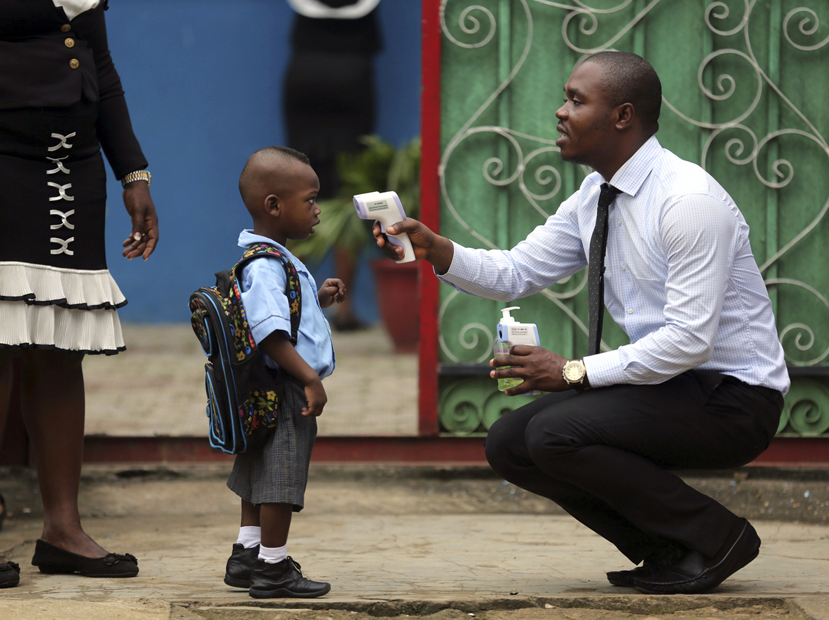 A school official shows a pupil an infrared digital laser thermometer before taking his temperature in Lagos, Nigeria, in September. Starting this week, similar hand-held devices are checking foreheads for fever at some U.S. airports.