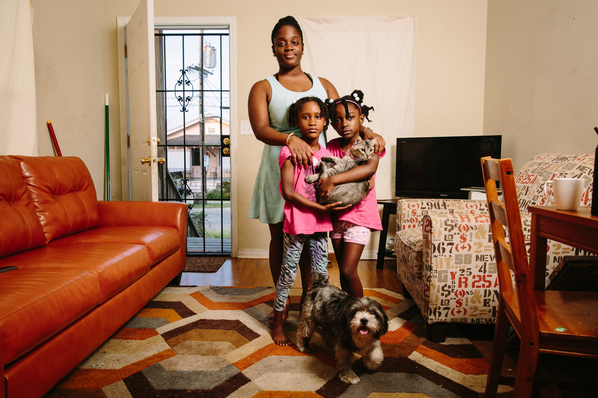 Briceshanay Gresham laughs with her daughter Uri (wearing shorts) and sister Dyha. Ten years after escaping Katrina, Gresham teaches elementary school in New Orleans and is studying to become a music therapist.