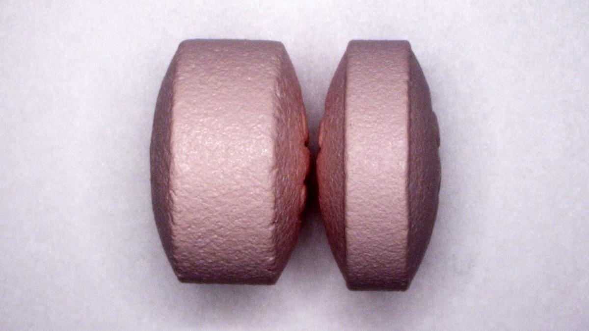 A reformulated OxyContin pill (left) releases its active ingredient over time, but an added polymer makes it difficult to crush, melt or prepare for injection. When heated, the polymer forms a viscous gel that binds the active ingredient.