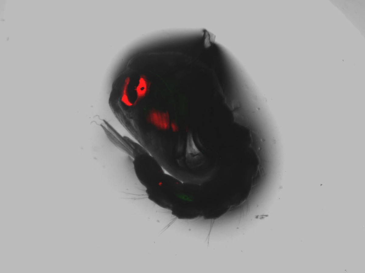 When Andrew Hammond modifies mosquitoes with gene drives, he also inserts a gene that causes the eyes of the mosquito pupa to glow red when illuminated with a laser. Courtesy of Andrew Hammond hide caption