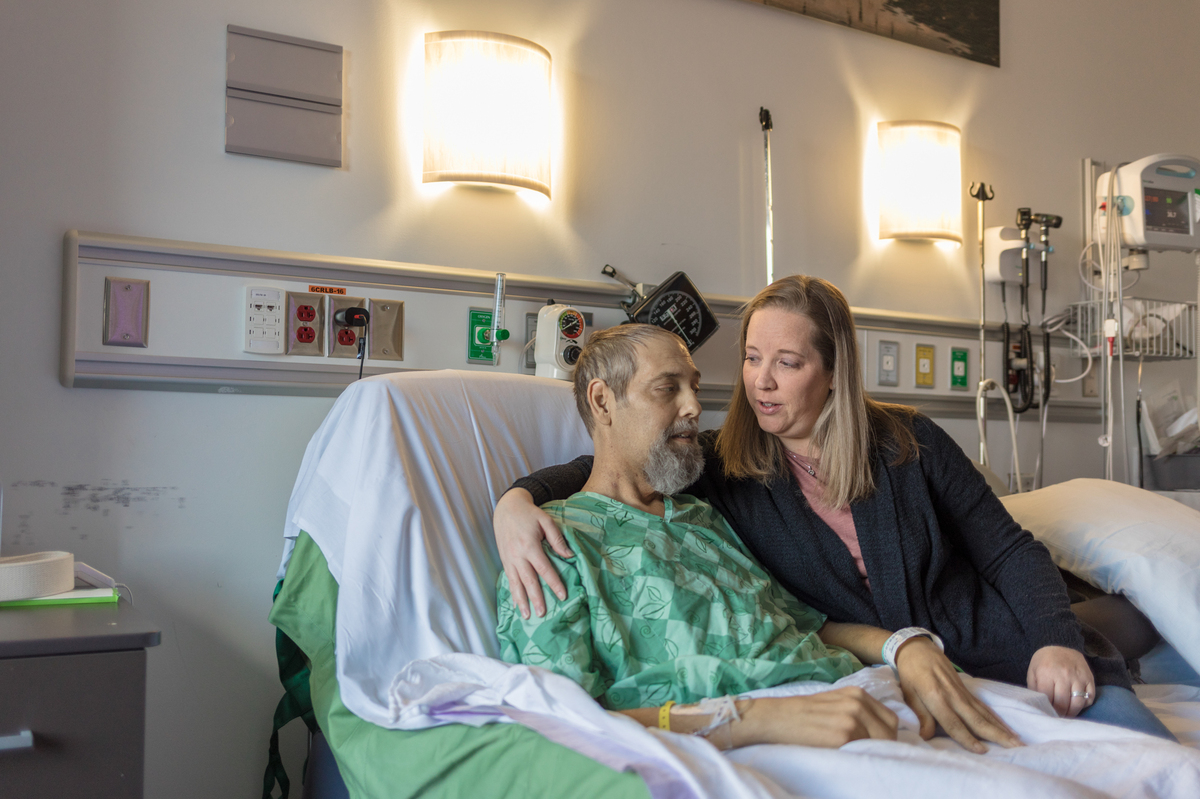 Shauna Pelfrey talks to her husband, Dorian, while preparing for his dialysis appointment.