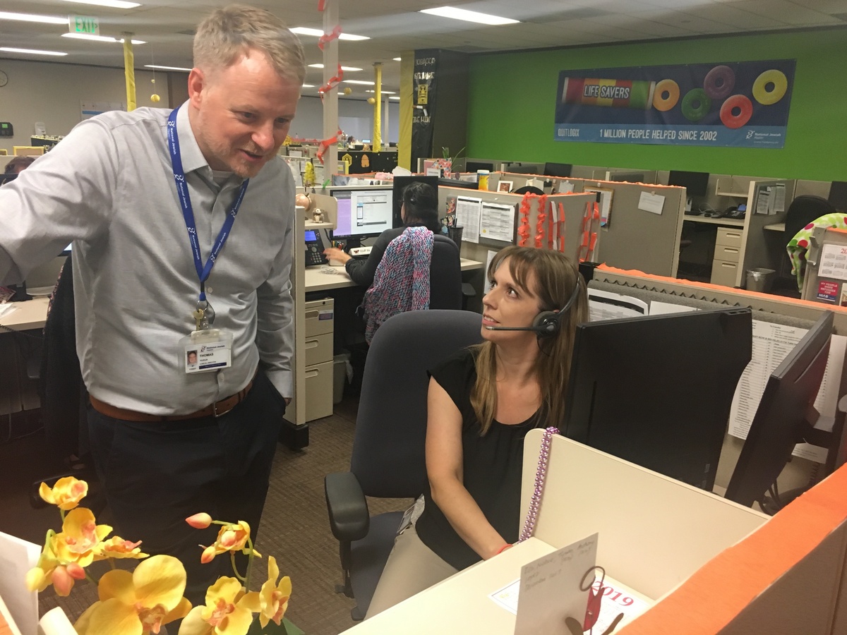 Thomas Ylijoa, a clinic director with National Jewish Health in Denver., chats with Nichole Lopez, a tobacco cessation coach for a program there. In July, the hospital launched "My Life, My Quit" a vaping cessation program aimed at teens. The program has a traditional phone helpline, but also offers coaching by text and chat.