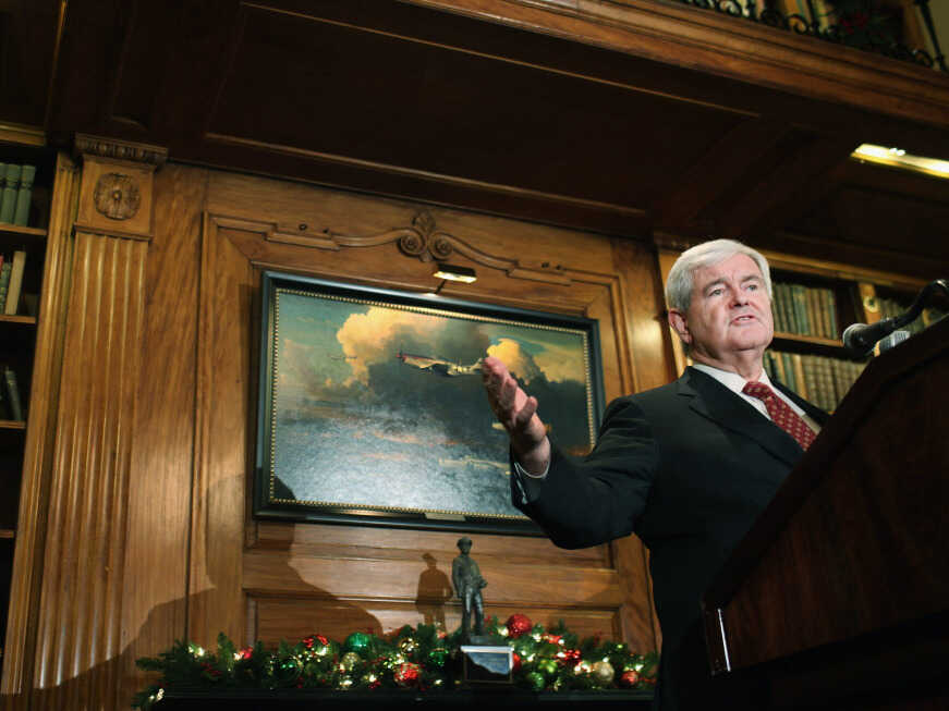 Republican presidential candidate Newt Gingrich speaks to the media at the Union League Club following an earlier meeting with Donald Trump at Trump Tower on Dec. 5 in New York City. Spencer Platt/Getty Images hide caption