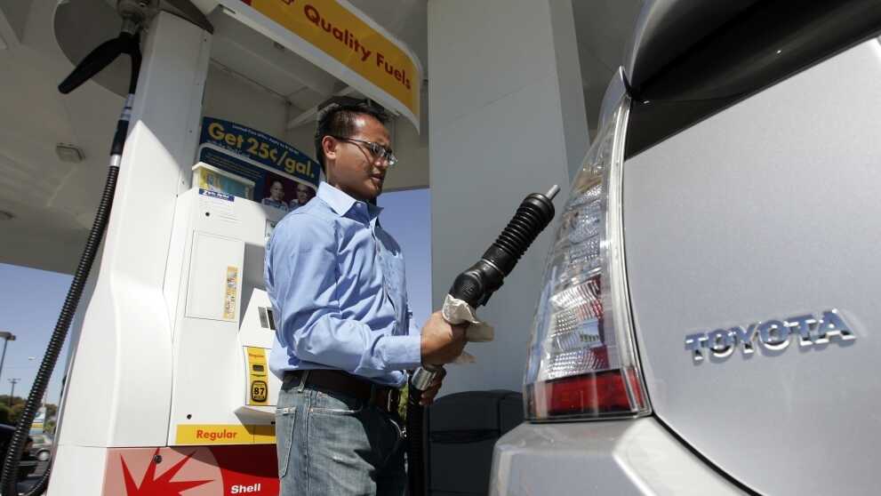 A driver pumps gas into his Toyota Prius hybrid at a gas station in Sunnyvale, Calif., in 2007.