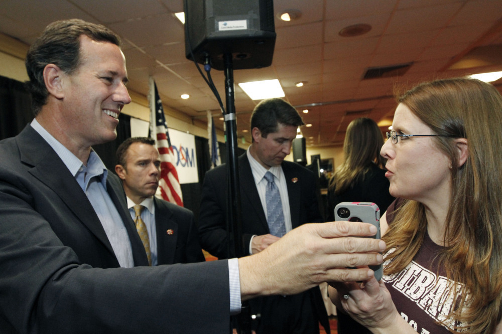 Rick Santorum takes the phone to speak to a supporter's husband, who couldn't attend a Shreveport, La., rally, on Friday.