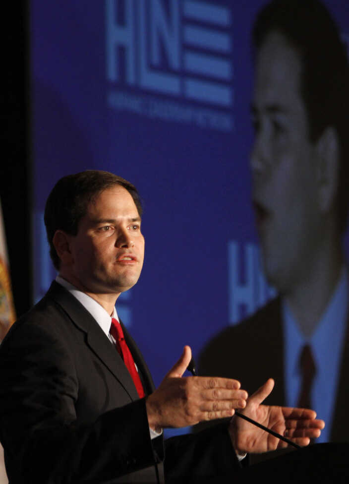 Sen. Marco Rubio, R-Fla., talks at the Hispanic Leadership Network in Miami on Jan. 27. Alan Diaz/AP hide caption