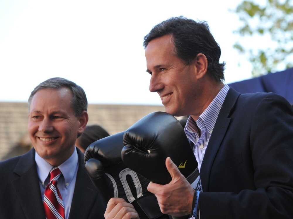 Rick Santorum speaks Wednesday in Hollidaysburg, Pa., holding boxing gloves given to him by Pennsylvania State Sen. John Eichelberger (left). On Thursday, Santorum met in private with a group of conservative leaders to discuss next steps in his campaign.