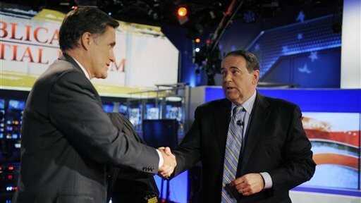 Running mates? Mitt Romney greets former Gov. Mike Huckabee after taking part in a Republican presidential forum on Huckabee's Fox News program on Dec. 3, 2011. Henny Ray Abrams/AP hide caption