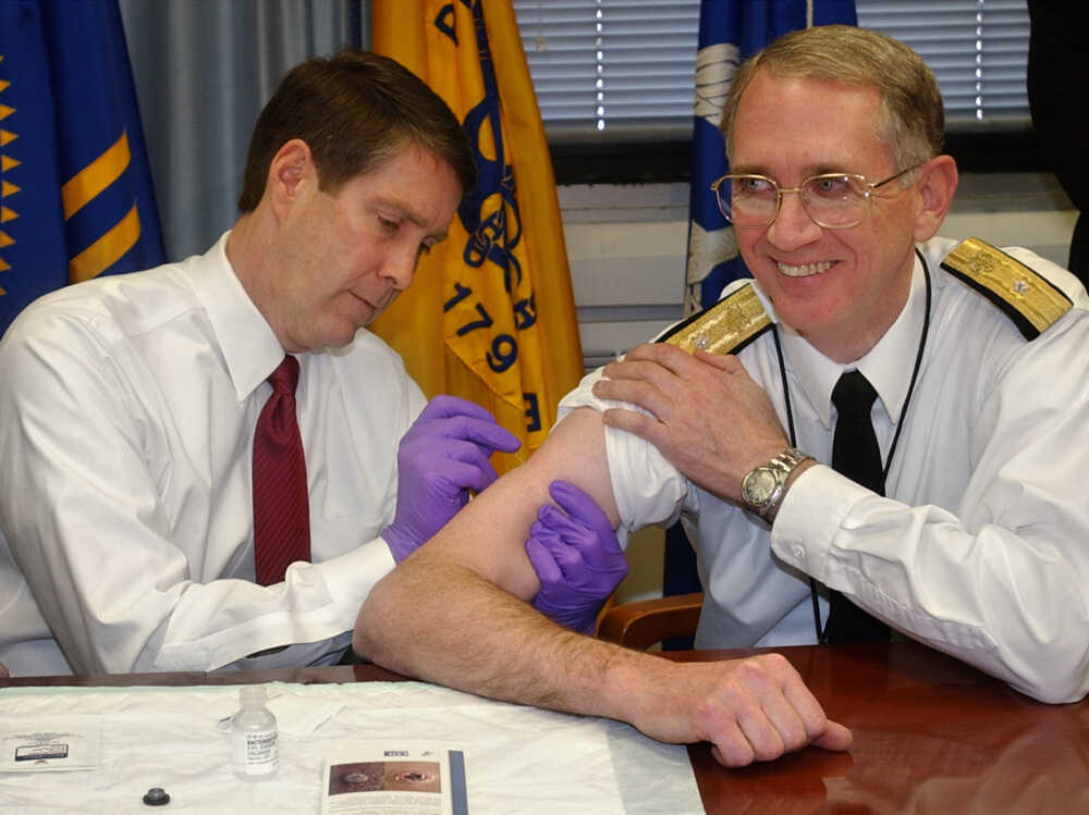 Sen. Bill Frist (left) gives a mock smallpox vaccine during a training session in 2003. Frist, a surgeon, once gave CPR to a visitor who collapsed in a Senate office building. Susan Walsh/AP hide caption