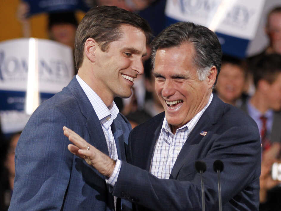 Republican presidential candidate Mitt Romney, seen at an election night rally in Denver with his son Josh on Feb. 7, once rode to the rescue on a Jet Ski. Chris Carlson/AP hide caption