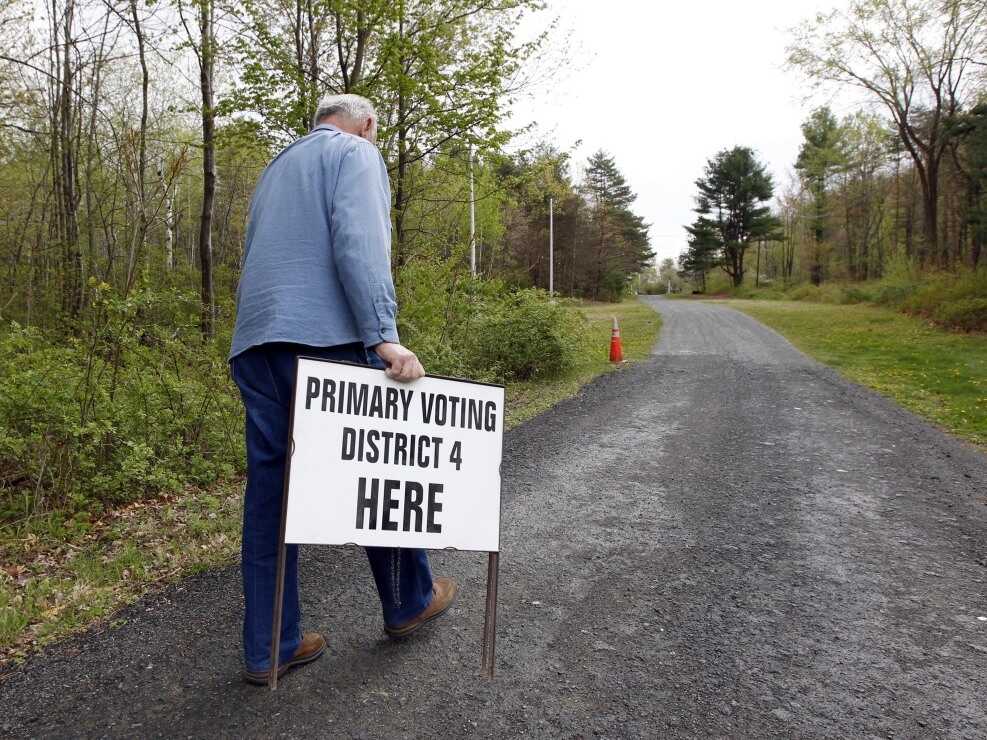 A man prepares to put in place an informational sign for voters on primary day 2012 in North Greenbush, N.Y. Mike Groll/AP hide caption