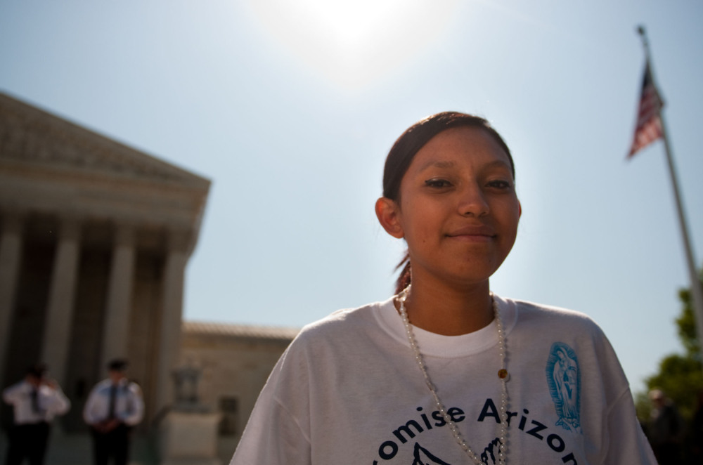 "SB 1070 has been racially profiling my family, my community and all the Latino community all over the country. [My father] went to look for work in California, and at the state line he was detained, and he was racial-profiled, and he was being charged for drug smuggling, but they could never find real good evidence to say that ... He has a work permit. He has an Arizona driver's license."
