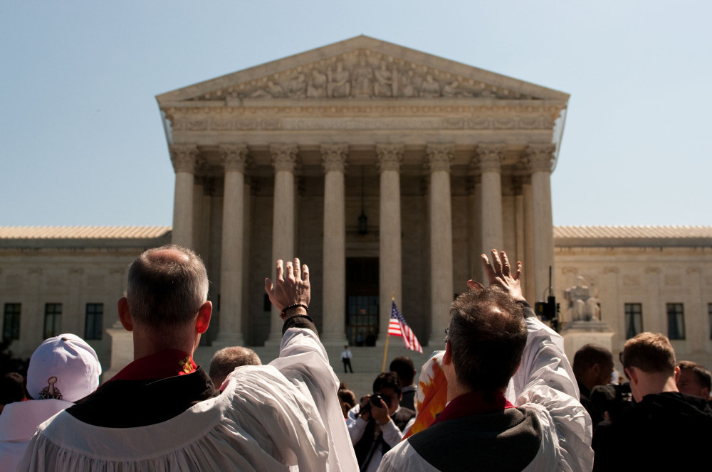 Later in the morning, as oral arguments began inside, clergy members opposed to the law circled the building in a self-titled "Jericho Walk," while others held up images of the Virgin of Guadalupe and Jesus.