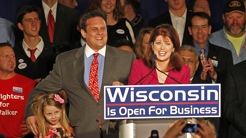 In this photo taken in November 2010, Lt. Gov.-elect Rebecca Kleefisch speaks to supporters in Pewaukee, Wis. Jeffrey Phelps/AP hide caption