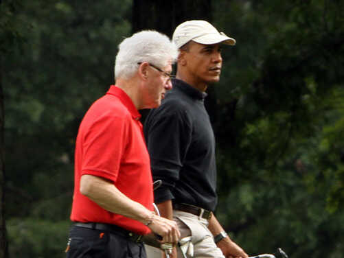 President Obama and former President Bill Clinton golf together in September 2011. The former president is campaigning for Obama, four years after the two men exchanged harsh words during the Democratic primary battle between Obama and then-Sen. Hillary Clinton. Chris Kleponis-Pool/Getty Images hide caption
