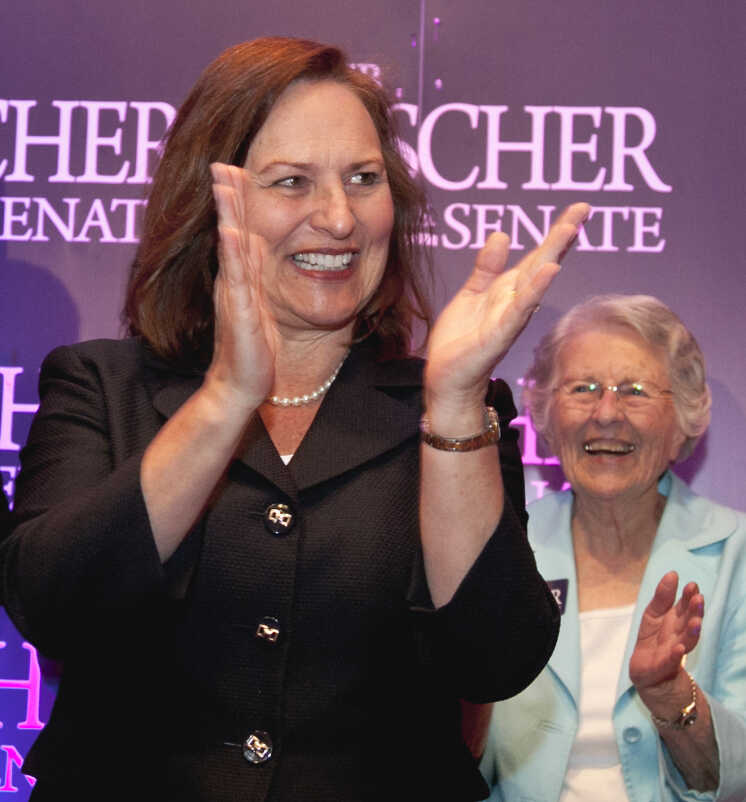 Nebraska state Sen. Deb Fischer applauds supporters at her election party Tuesday in Lincoln, Neb. At right is Fischer's mother, Florence Strobel.
