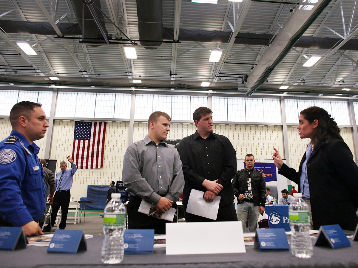 Military veterans Kris Hummel (l) and Shane Foley, speak with a TSA representative at a May 15, 2012 job fair in Utica, NY. Spencer Platt/Getty Images hide caption