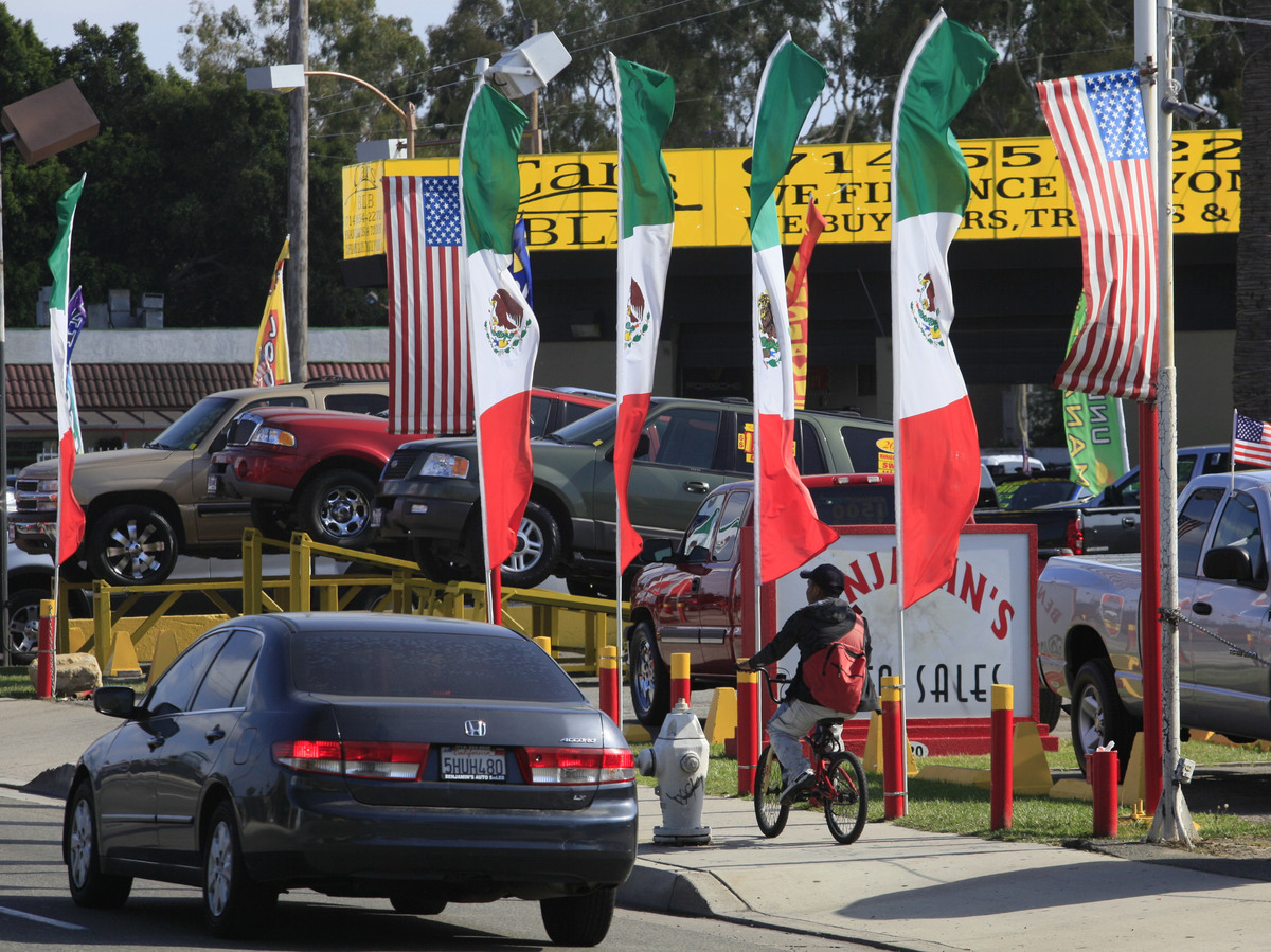 U.S. and Mexican flags decorate an auto shop in Santa Ana, Calif., June 2011.