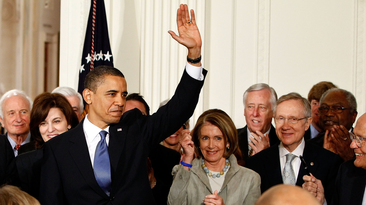 President Obama waves after signing the Affordable Care Act at the White House on March 23, 2010. Chip Somodevilla/Getty Images hide caption