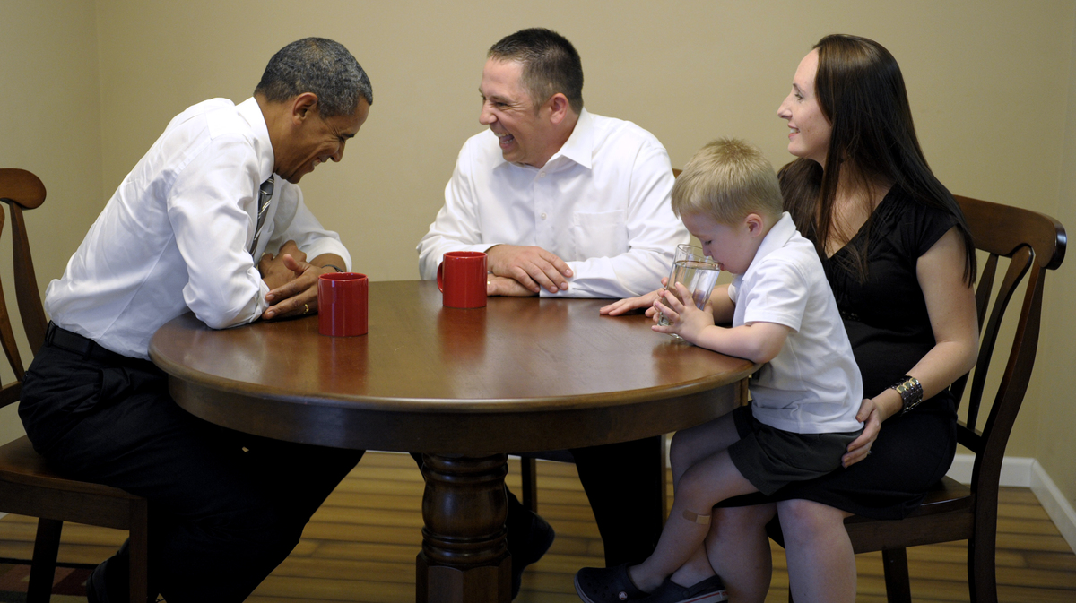 President Obama meets with Jason and Ali McLaughlin and their son, Cooper, while visiting their home in Cedar Rapids, Iowa.