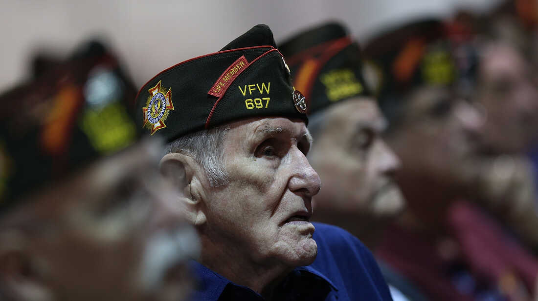 Members of the Veterans of Foreign Wars look on Monday as President Obama speaks during the group's national convention in Reno, Nev. Republican Mitt Romney was scheduled to speak to the group on Tuesday. Justin Sullivan/Getty Images hide caption