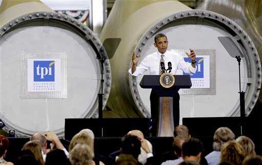 President Obama at a Newton, Iowa, wind-turbine blade maker in May. Charlie Neibergall/AP hide caption