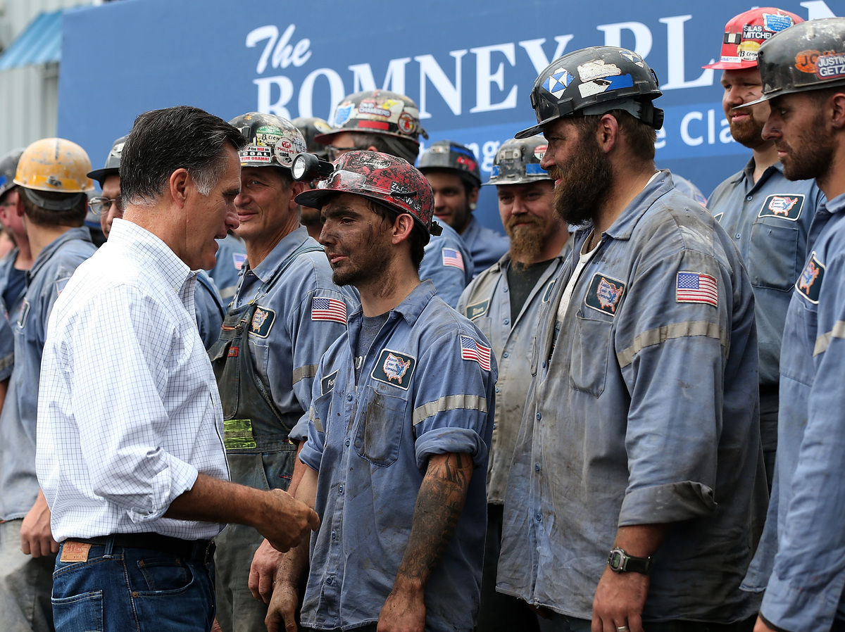 Republican presidential candidate Mitt Romney greets coal miners during a campaign rally in Beallsville, Ohio, on Tuesday. Justin Sullivan/Getty Images hide caption
