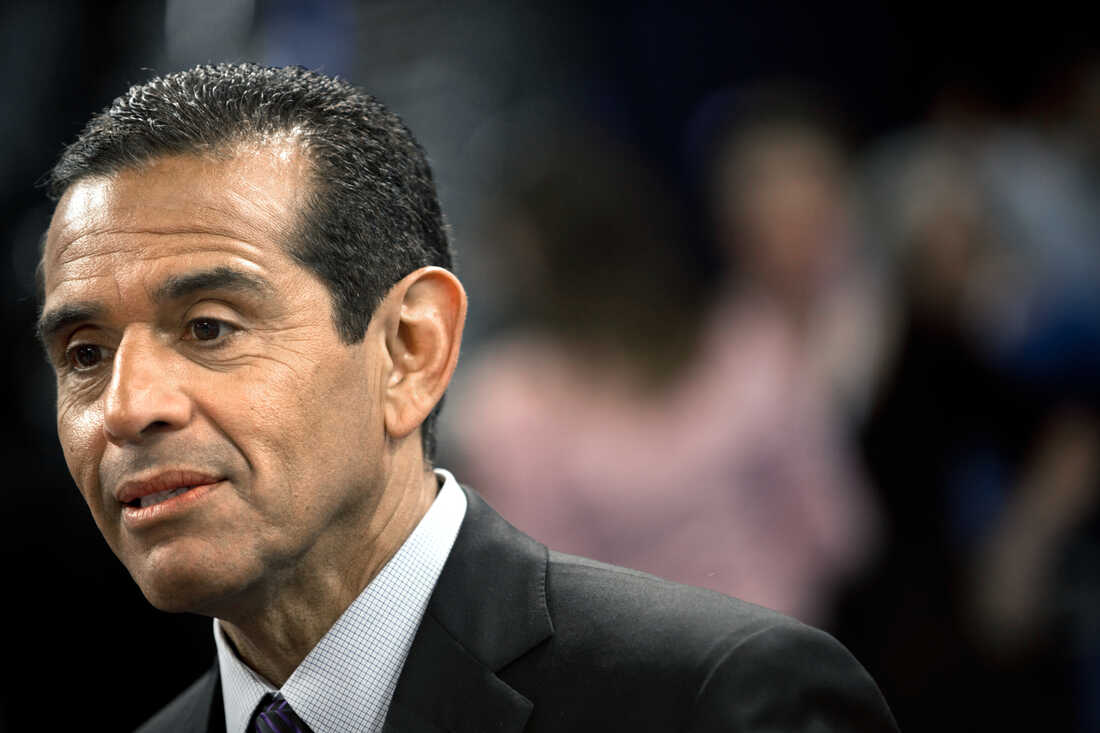 Los Angeles Mayor Antonio Villaraigosa on the floor of the Time Warner Cable Arena on Sunday. Brendan Smialowski/AFP/Getty Images hide caption